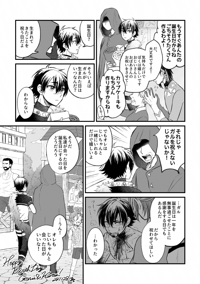 確認のために中文で読んでたんですが、誕生日がおじいちゃんと「暮らし始めた日」であることにびっくりして動揺してしまった。日本語訳ではおじいちゃんと「会った日」だったので…でもクラインスターの時系列を考えるとその頃のガルくんが覚えてる最初の記憶がおじいちゃんと暮らし始めた日だったのか〜!と今更ながらに気づいた。